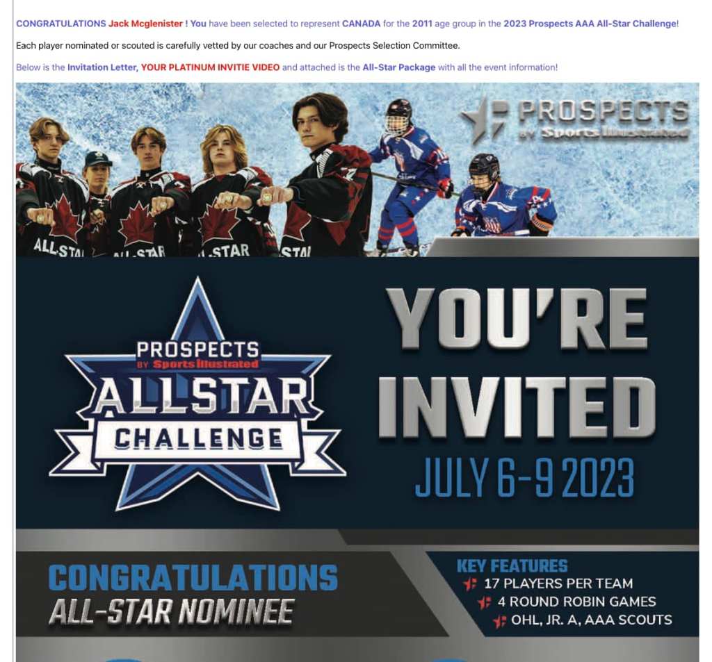 Jack, Woodstock local and forward for the U11 Brantford Minor 99ers, received his official invite to participate in the 2023 Prospects AAA All-Star Challenge after being either nominated or scouted by PSI coaches or Prospects Selection Committee members.